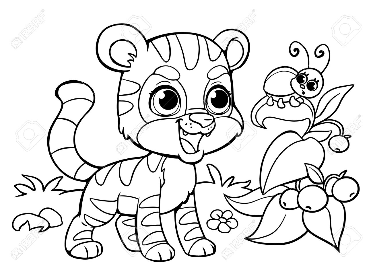 Coloring Pages Tiger And Beetle On The Bush Wild Animals Smiling Wild African Beast Educational Developmental Lesson A Task Waiting For Preschoolers Black And White Royalty Free SVG Cliparts Vectors And Stock