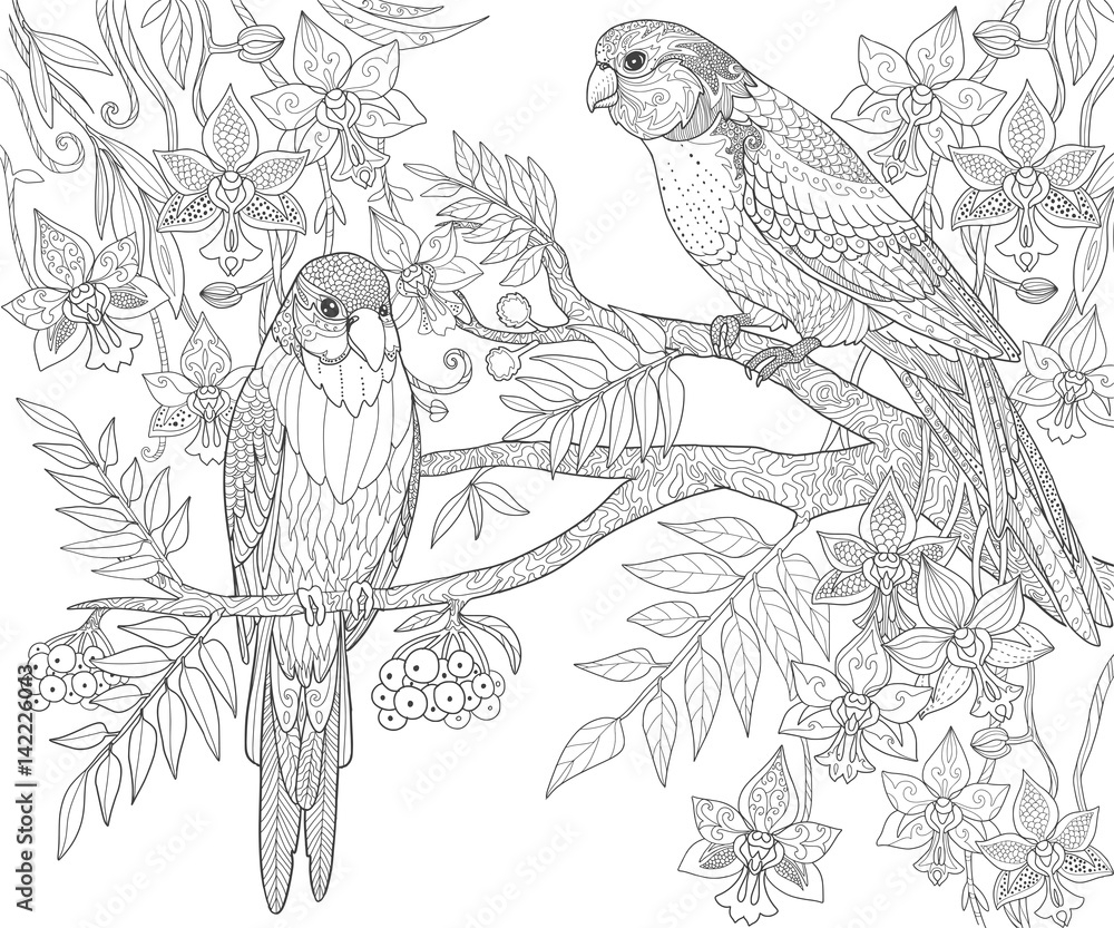 Parrots Sit On A Branch In The Jungle Adult Coloring Book Page Doodle Tropical Birds Vector Illustration Stock Vector Adobe Stock